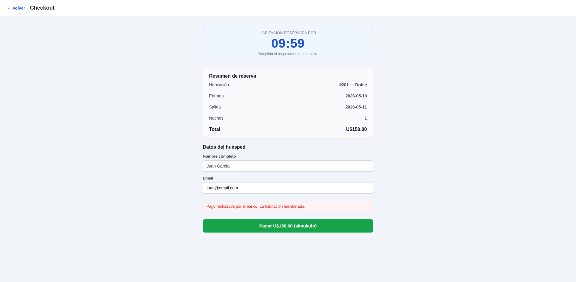 Entonces el sistema informa que el pago fue rechazado por el banco